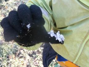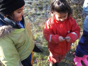 After the toasting was finished the children took it in turns to pour water on the fire to extinguish it and shared with the group what they had learned. Once all the fire kit was safely packed away, some of the group were keen to finish the session with a game of 123 where are you. Meanwhile Maryam chose to study the ice crystals that had formed on the woodland shrubs.